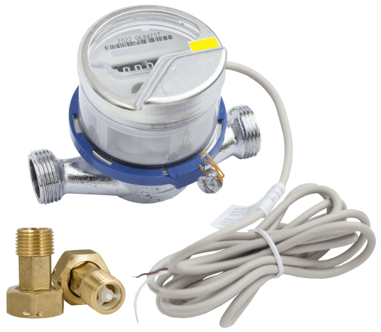 Счетчик воды Миномесс СВХИ, 40°C, DN 15, Qn 1,5, L 80 mm, с импульсным датчиком (1L/Imp.), с присоединителями с обратным клапаном